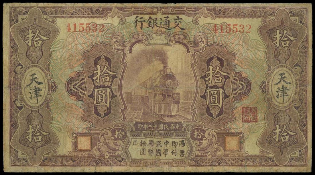 Bank of Communications, $10, Fengtien Province/Tientsin, 1923, serial number 415532, purple and multicolour, steam passenger train at centre, bank building on reverse,