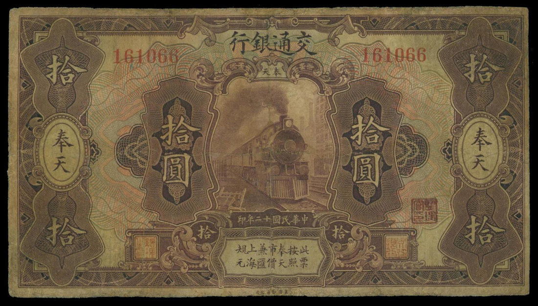 Bank of Communications, $10, Fengtien Province, 1923, serial number 161066, purple and multicolour, steam passenger train at centre, bank building on reverse,