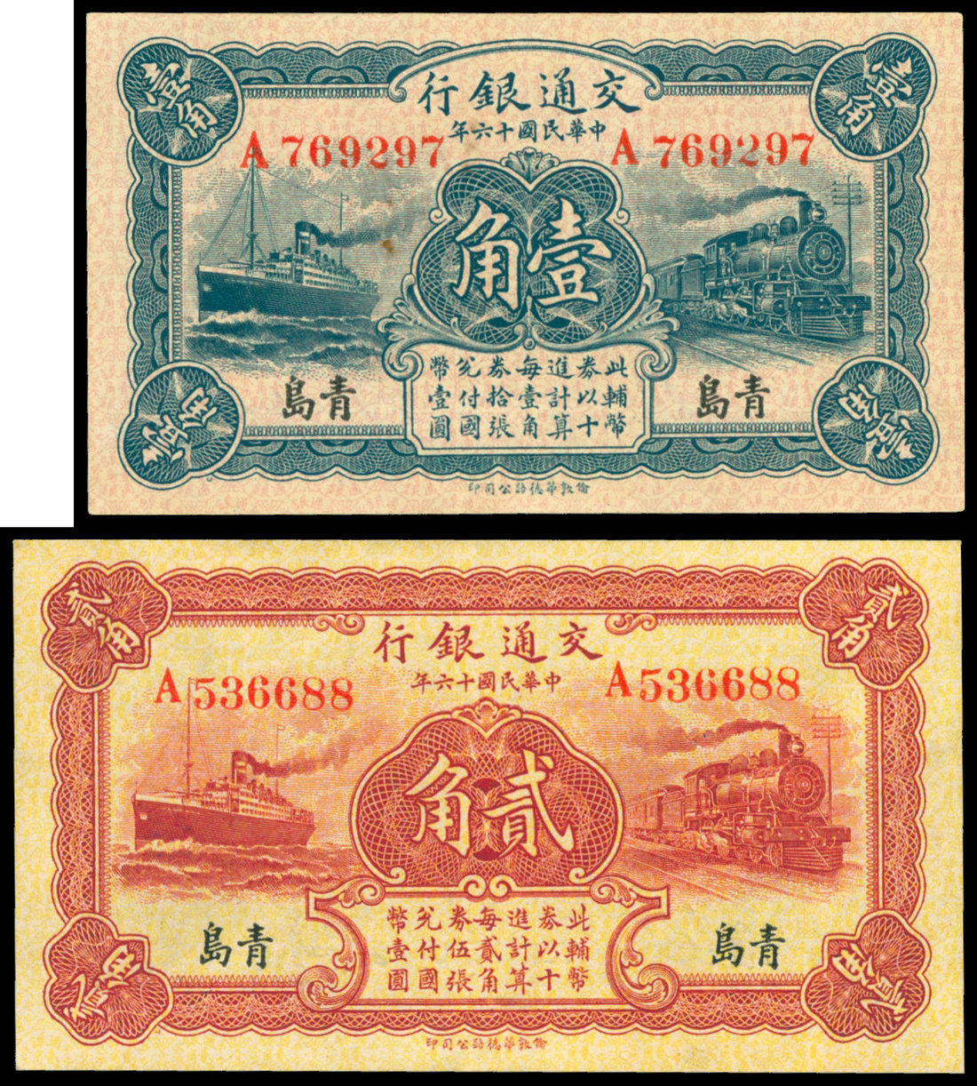 Bank of Communications, pair of fractional notes for 10 and 20 cents, Tsingtau, 1927, blue and red respectively, similar designs showing a steamship at left and steam passenger train respectively,