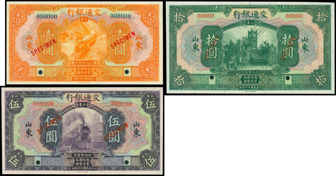 Bank of Communications, specimen set of 3 notes, 1, 5 and 10 yuan, Shantung, 1927, orange, green and violet respectively,