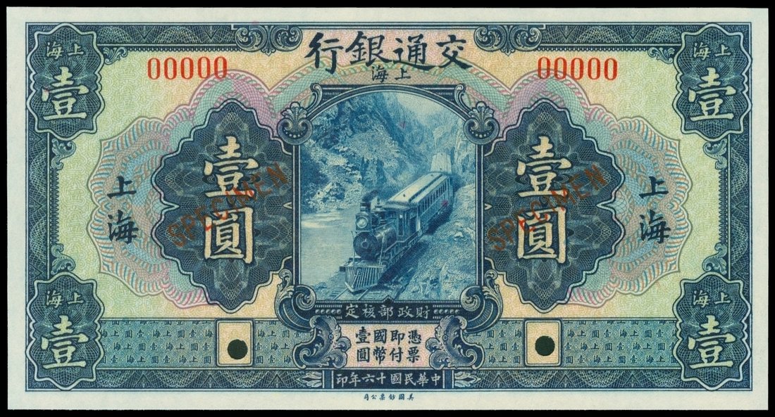 Bank of Communications, 1 yuan, 1927, Shanghai, specimen, blue and multicolour underprint, steam train at centre, reverse blue and multicolour underprint, hole punch cancelled, 'SPECIMEN' overprint in red,