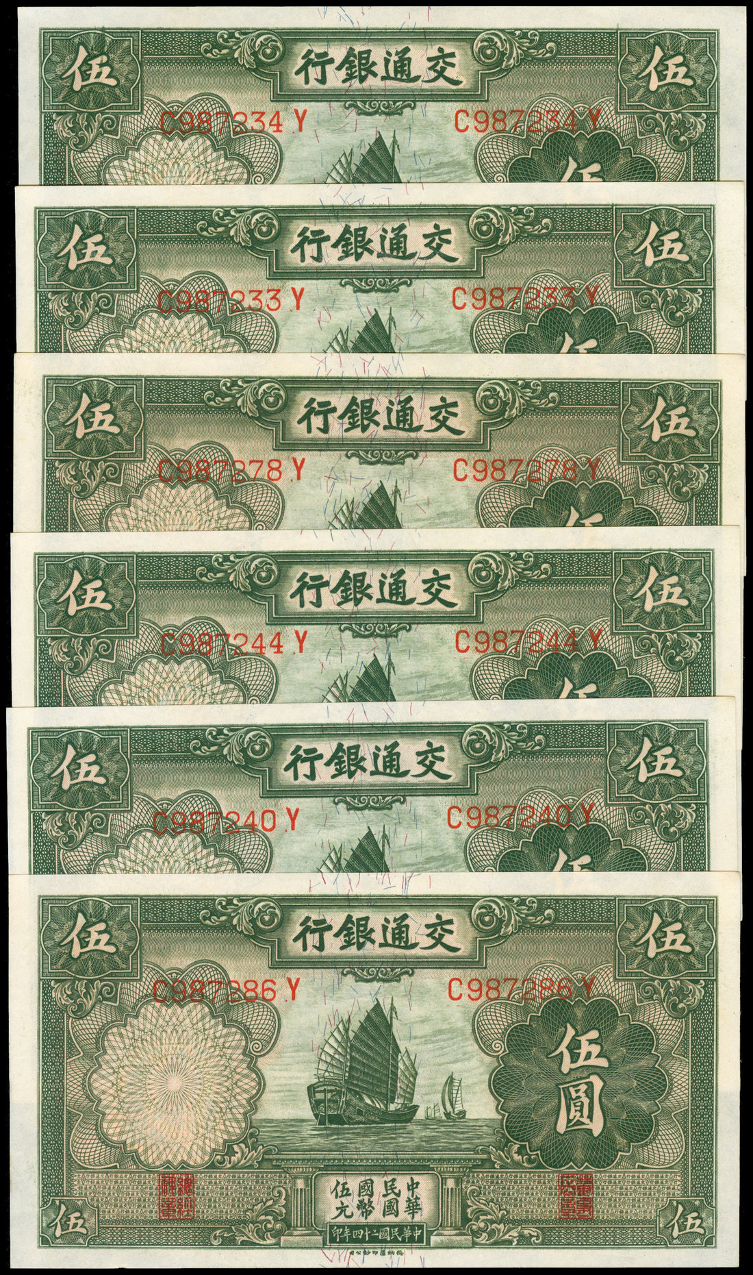 Bank of Communications, a lot of six 5 yuan, 1935, dark green on light pink underprint, junks at centre, reverse dark green, view of Summer Palace at centre,