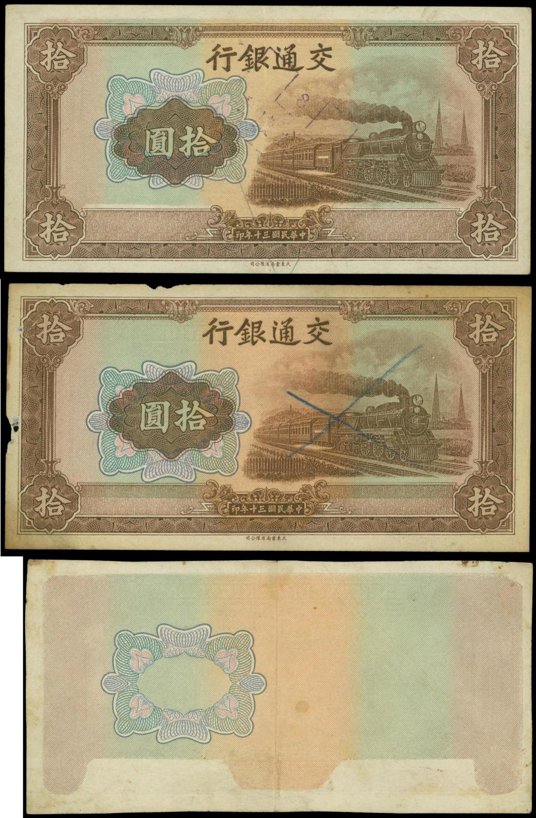 Bank of Communications, a lot of 3 x 10 yuan, 1941, consisting of two error and a progrssive proof notes, brown on light green and pink underprint, steam train at right on obverse,