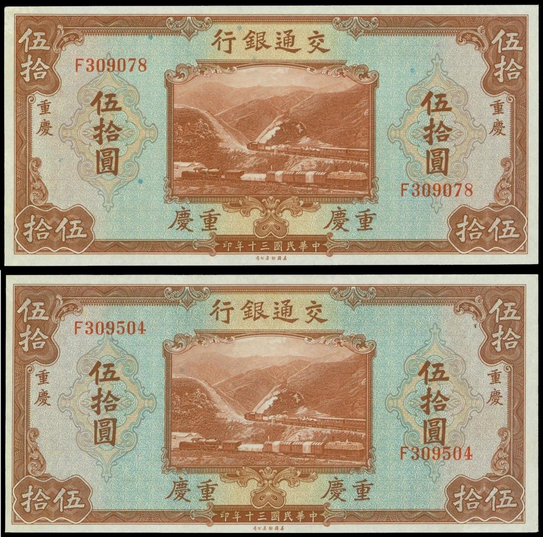 Bank of Communications, pair of 50 yuan, Chungking, serial number F309078 and F309504, brown on blule, train passing through hills at centre,