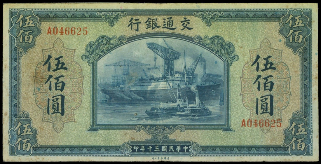 Bank of Communcations, 500 yuan, 1941, serial number A046625, blue on multicolour, dockside scene at centre, value at each corner, reverse blue, steam train passing through between two electricity pylons on reverse,