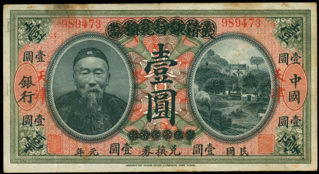 Bank of China, $1, no date (1912), Tientsin, serial number 989473, overprinted on the 1909 issue, black, orange and olive green, Li Hong Zhang at left, hillside village scene at right, reverse orange and black, waterway at centre,