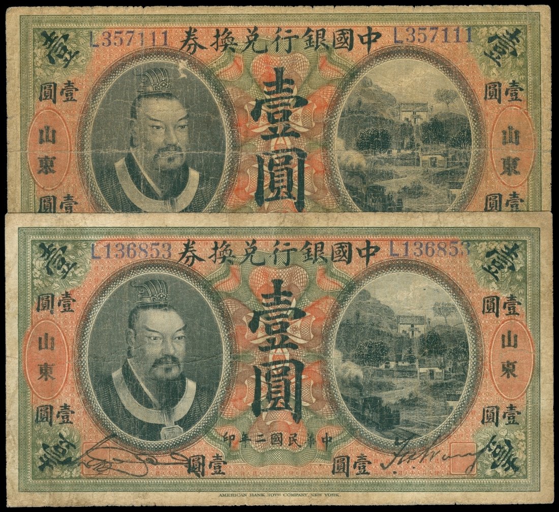 Bank of China, $1, 1913, serial number L357111, L136853, olive and red, Huang-ti at left, hillside village and railroad at right, reverse red,