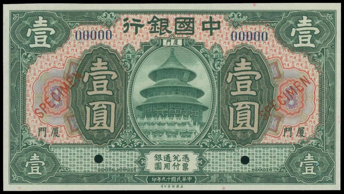 Bank of China, $1, 1930, Amoy, specimen, green on multicolour underprint, Temple of Heaven at centre, reverse green,