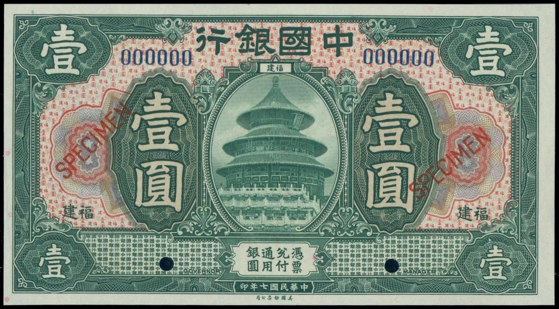 Bank of China, $1, 1918, Fukien, specimen, green on multicolour underprint, Temple of Heaven at centre, reverse green,