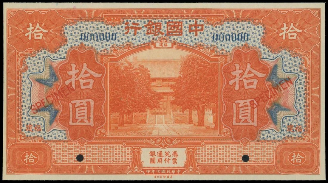 Bank of China, $10, 1918, Fukien, specimen, orange on light blue underprint, temple behind trees at centre, reverse orange,