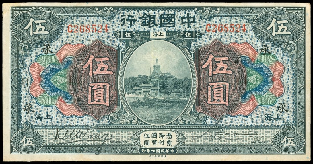 Bank of China, 5 yuan, 1918, Shanghai, serial number C268524, grey green on multicolour underprint, Summer Palace at centre, reverse green, red Chinese characters overprinted,