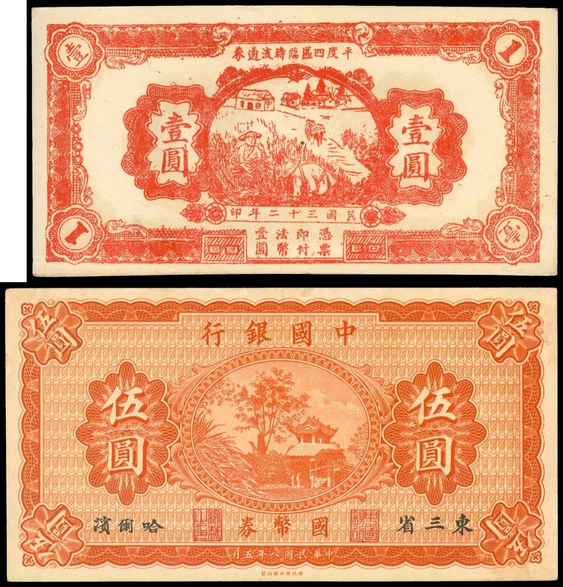 Bank of China, 5 yuan, 1919, Harbin, Manchuria, remainder, together with a Ping Du 4th Zone 1 yuan, 1943, remainder, orange and red respectively,