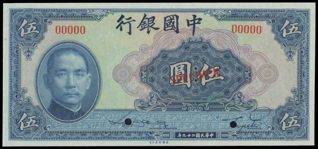 Bank of China, 5 yuan, 1940, specimen, blue on multicolour underprint, Sun Yat Sen at left, reverse blue, Temple of Heaven at right,