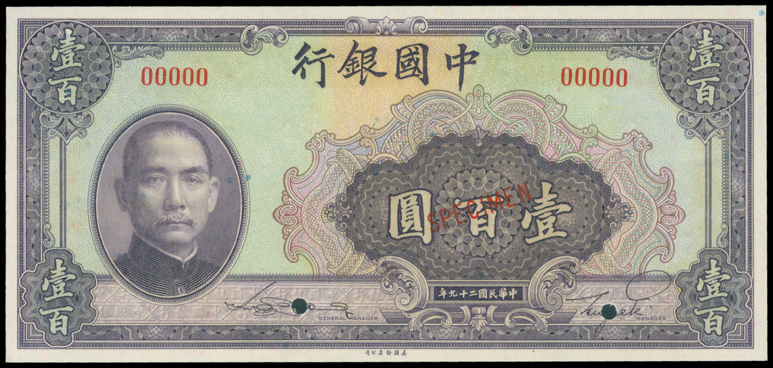Bank of China, 100 yuan, 1940, specimen, red serial number 00000, purple on multicolour underprint, Sun Yat Sen at left, reverse purple, Temple of Heaven at right,