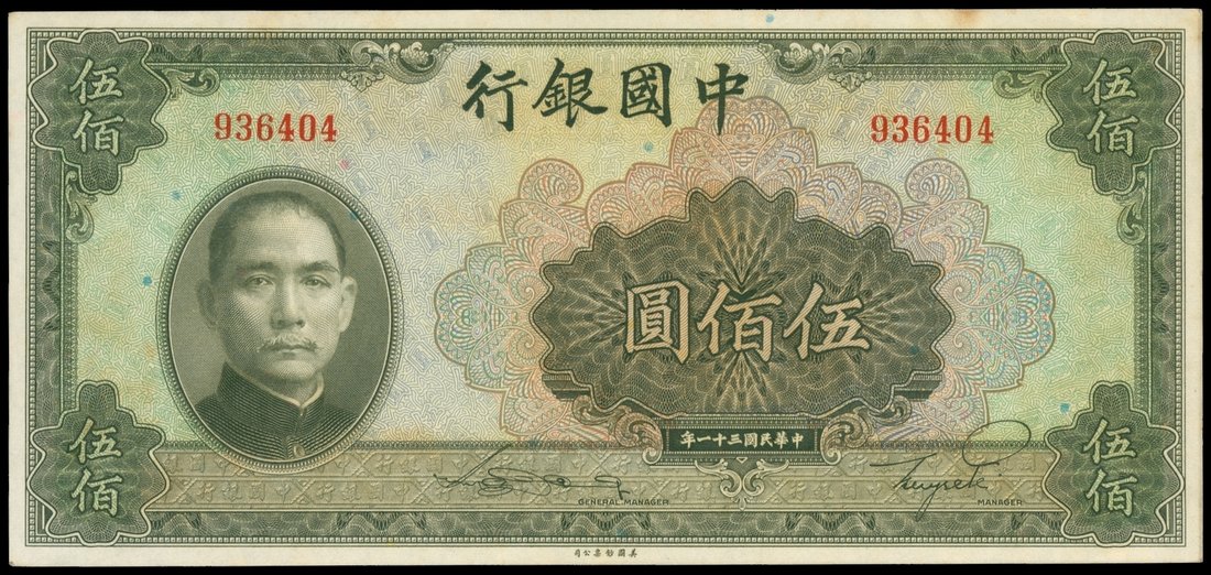 Bank of China, 500 yuan, 1942, serial number 936404, brown, green and multicolour, Sun Yat Sen at left, value at four corners, reverse brown, Temple of Heaven at right,