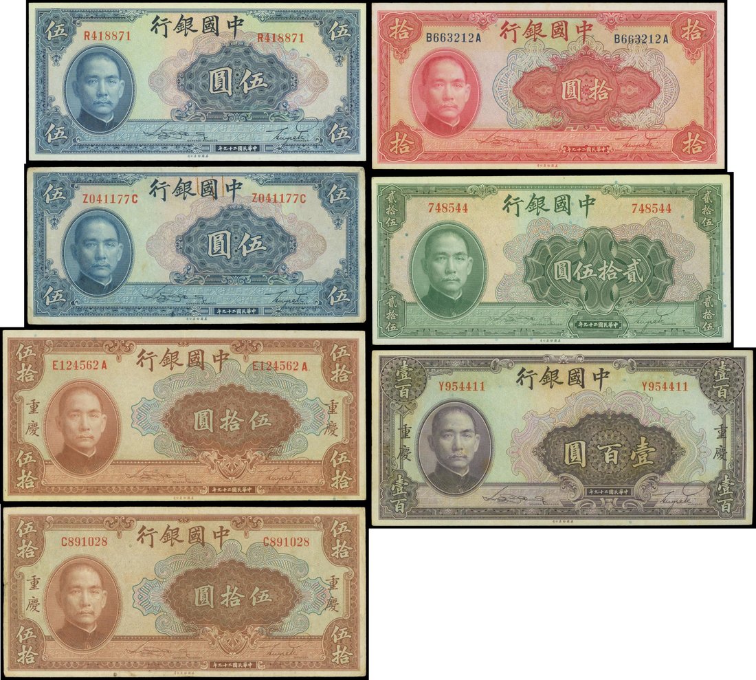 Bank of China, group of 7 notes, the 1940 issue, consisting of the 5 yuan (2), 10 yuan, 25 yuan, 50 yuan (2) and 100 yuan,