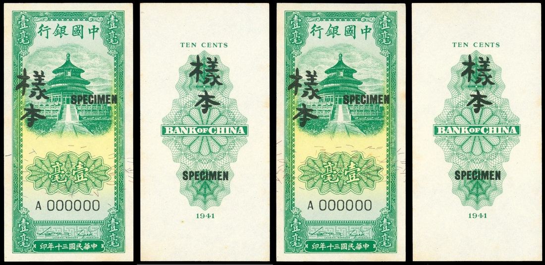 Bank of China, a pair of uniface obverse and reverse 10 cents specimen, 1941, small vertical format, green on yellow underprint, Temple of Heaven at top on obverse, reverse green, black Chinese and English 'Specimen' overprinted,