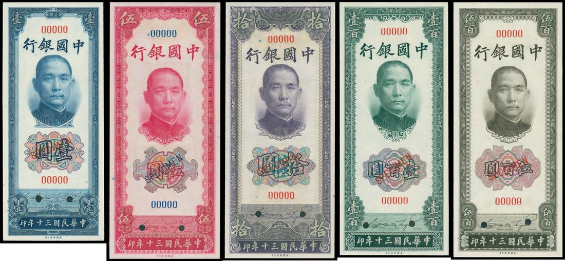 Bank of China, set of 5 specimen notes, 1941, serial number 00000, vertical format, Sun Yat Sen at top centre on obverse, reverse shows the Temple of Heaven at low centre, hole punch cancelled, ‘SPECIMEN’ overprinted in red or blue,