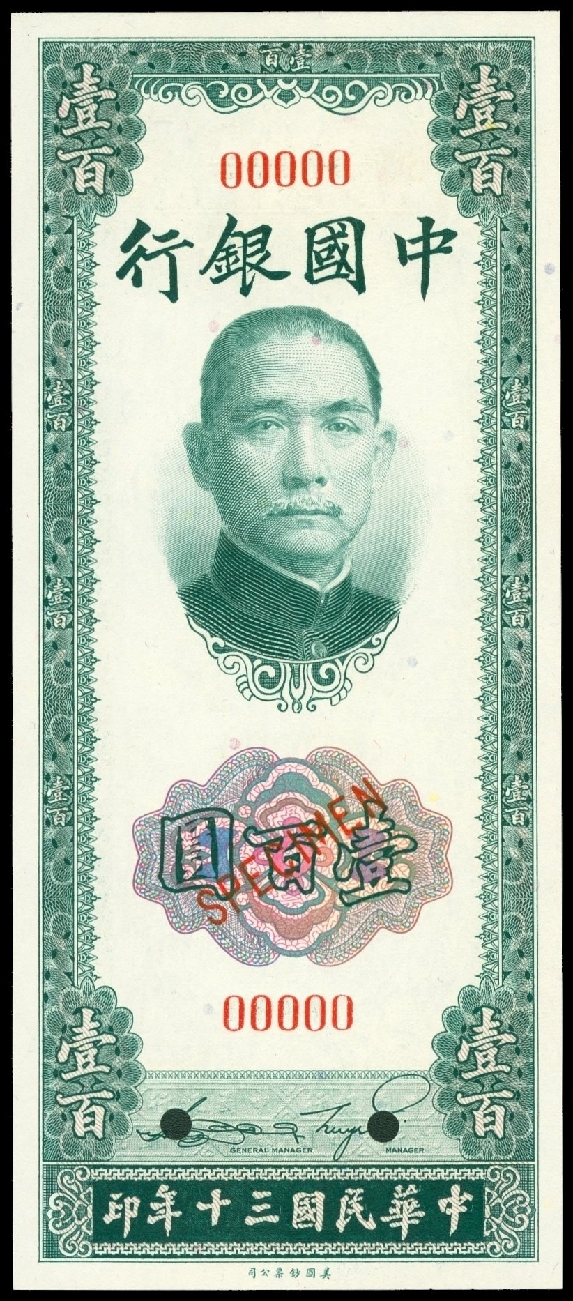 Bank of China, 100 yuan, specimen, 1941, red serial number 00000, vertical format, green and multicolour guilloche, Sun Yat Sen at top centre, reverse green, Temple of Heaven at centre bottom,