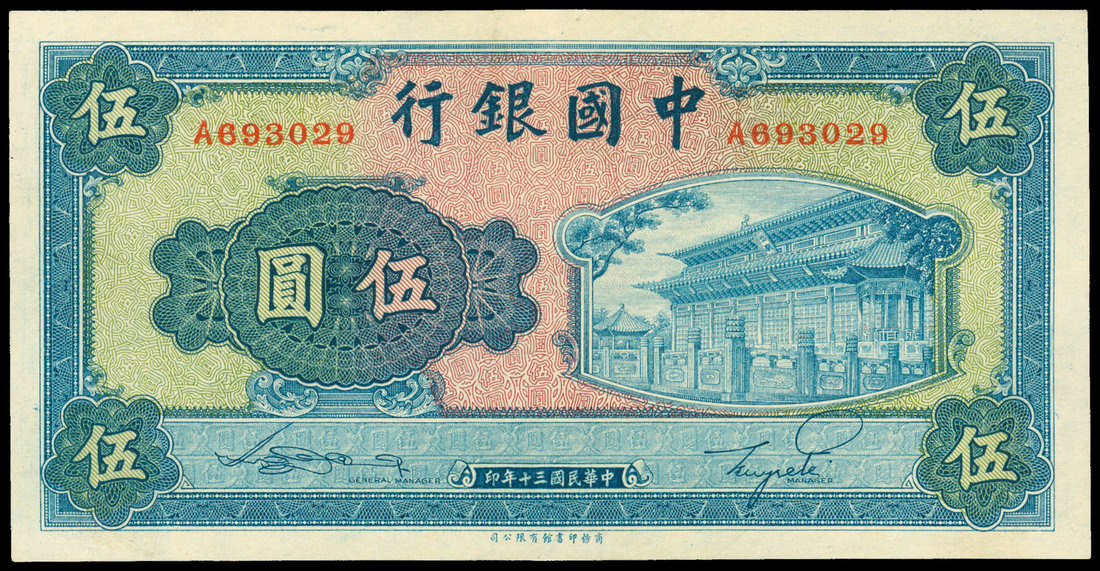 Bank of China, 5 yuan, 1941, serial number A693029, blue on yellow and light green underprint, palace at right, reverse blue, gateway at right,