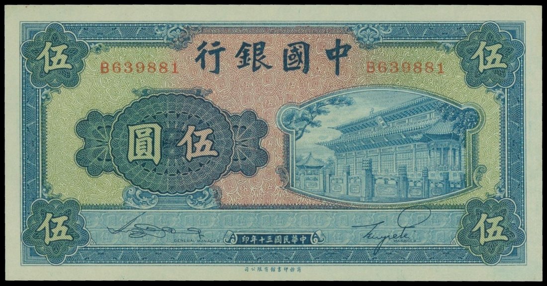 Bank of China, 5 yuan, 1941, serial number B639881, blue, green and pink, Dai Temple at right, value at each corner, reverse blue, Chinese gateway at right, English text,