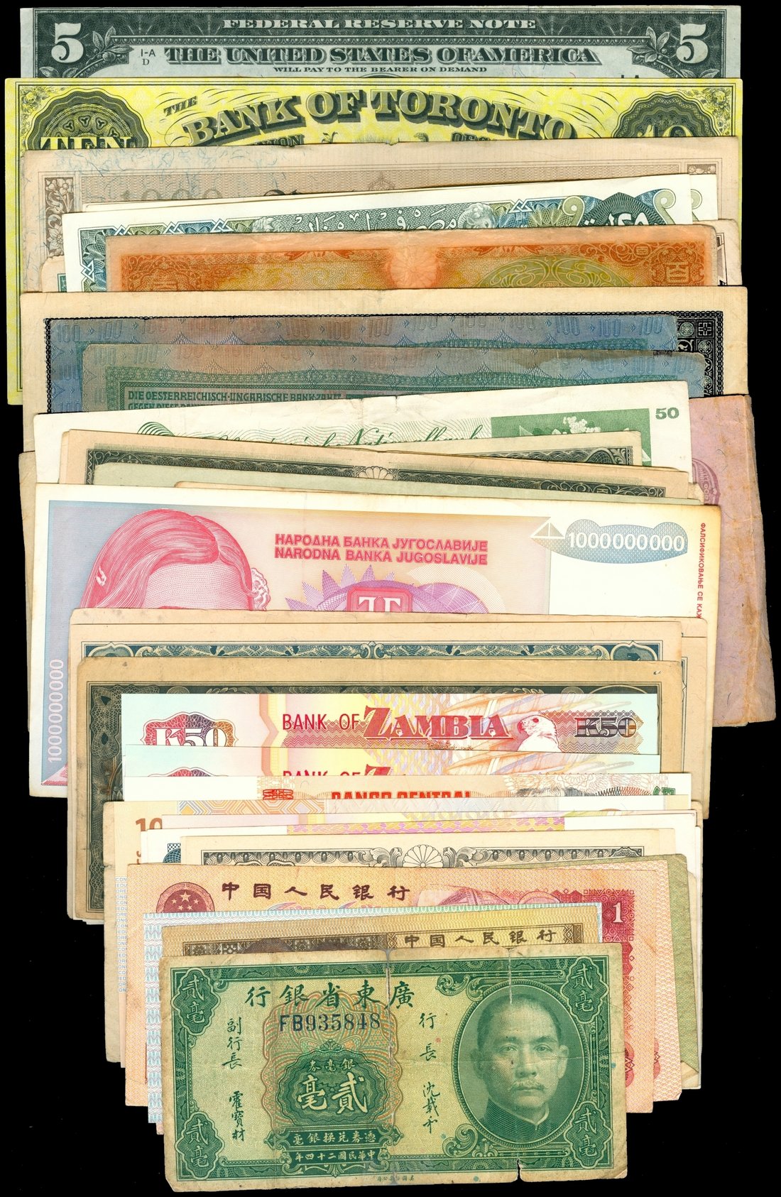World, an assortment of 78 notes from across the globe (namely United States, Canada, Japan, China, Europe, etc.), mostly from 1900s, namely United States $5, series of 1914, serial number A32170016A,