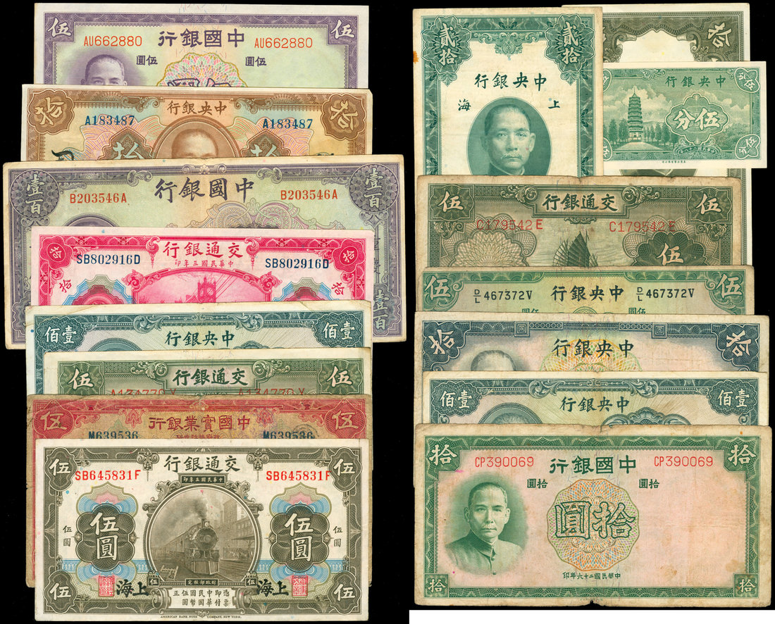 Republican era, group of 16 banknotes, mainly from the 'Big Four' banks, of note there is 5 yuan issued by the National Industrial Bank of China for circulation in Peking,