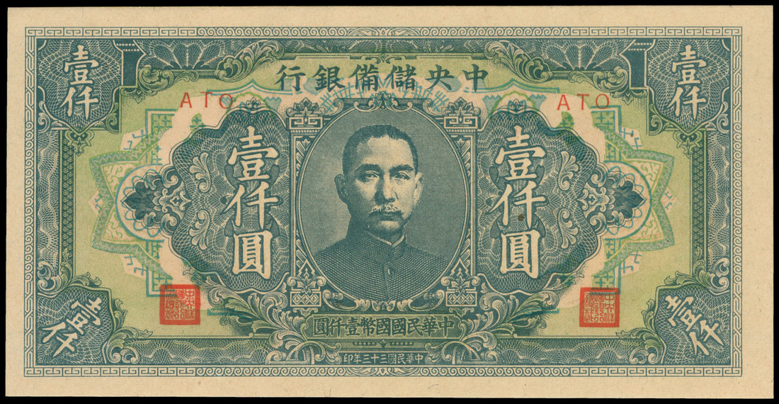 Central Reserve Bank of China, 1000 yuan, 1944, block serial number ATO, blue-grey on green, Sun Yat Sen at centre, red seal signature bottom left and right, reverse blue and pink, SYS Mausoleum,
