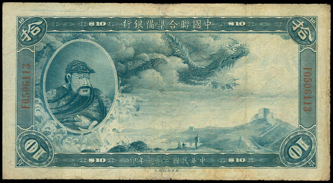 The Federal Reserve Bank of China, $10, 1938, serial number F0506113 blue, flying dragon at top centre, 'Guan Yu' at left, the Great Wall at bottom right,reverse dark blue,