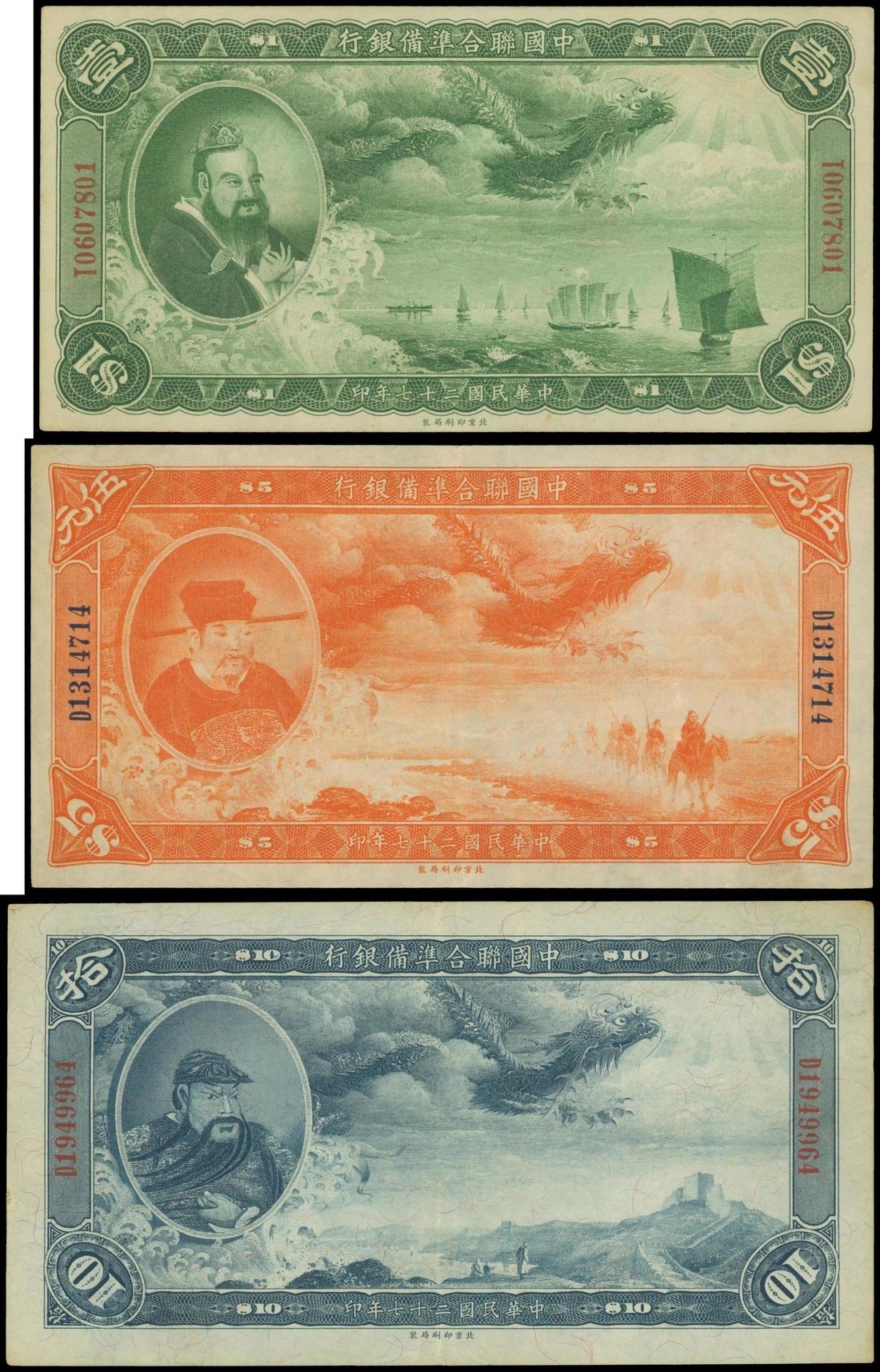 The Federal Reserve Bank of China, group of 3 notes for $1, $5 and $10, the 1938 issue, green, orage and blue, featuring Confucius, Yue Fei and Guan Yu respectively,