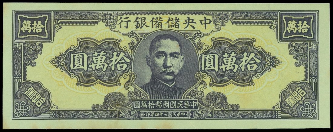 Central Reserve Bank of China, 100000 yuan, 1945, unissued note obverse, purple on green, Sun Yat Sen at centre, printed on dark paper