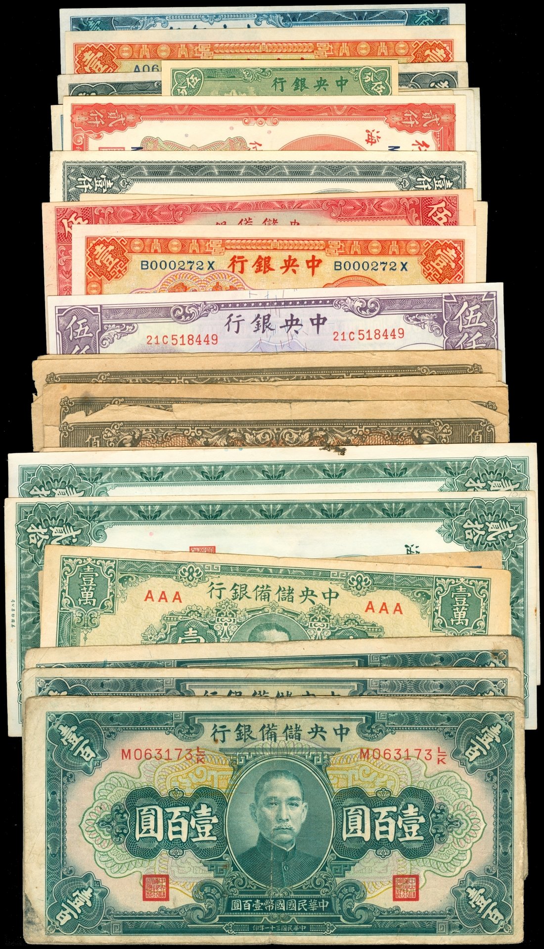 Mixed lot, Central Bank of China, 14 notes, 5 cents to 5000 yuan, Federal Reserve Bank of China, 9 notes, 1, 100 and 500 yuan, the Central Reserve Bank of China, 5, 100 and 10000 yuan,
