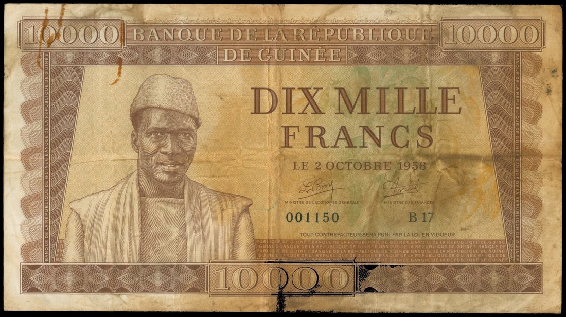 Banqye De La Republique De Guinee, 10000 francs, 2.8.1958, serial 001150 B17, brown and multicoloured, President Ahmed Sekou Touré at left, leaf pattern in orange and green at right, reverse brown and red, bauxite mining pit and machinery at centre,