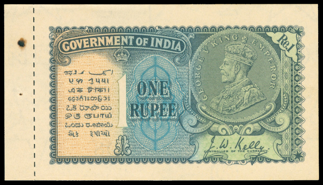 India, 1 rupee, ND (1935), serial nuber E/75 839498, green-blue, King George V at right, reverse shows the serial number, with perforation on left edge,
