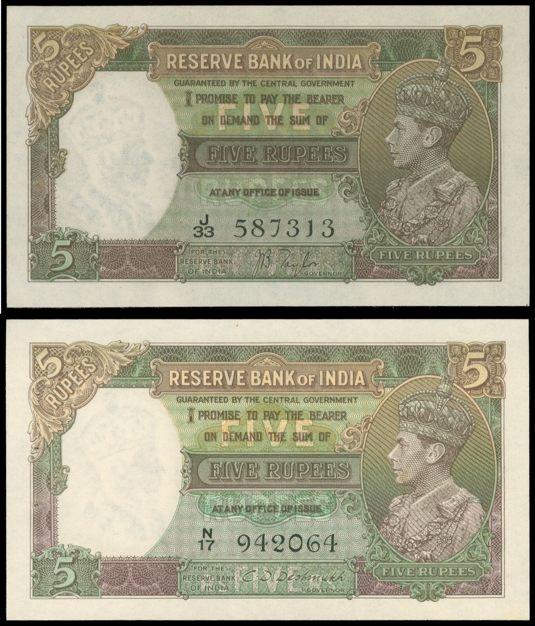 India, Reserve Bank of India, a pair of 5 rupees, ND(1943, 1937), serial number N17 942064, J33 587313, light brown and green, George VI at right, watermark of the same at left, reverse brown on green underprint,