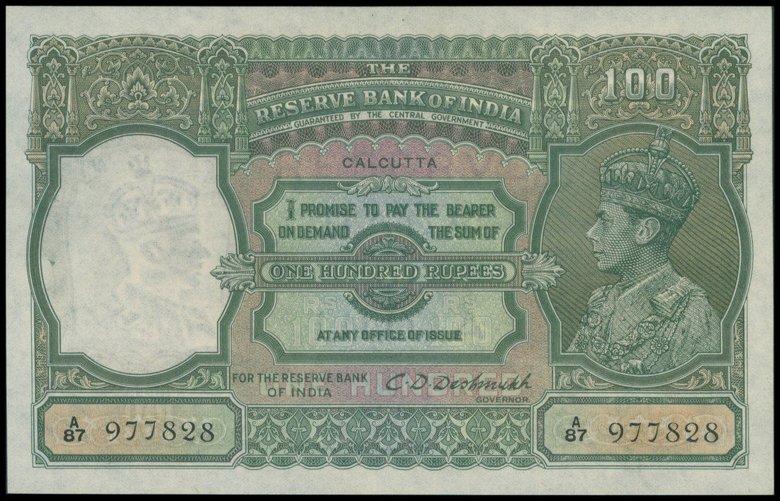 India, 100 rupees, ND (1943), serial number A/87 977828, dark green and lilac, King George VI at right, reverse dark green, tiger at centre, CALCUTTA,