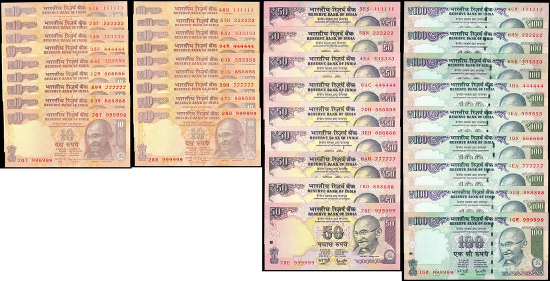 India, lot of 2 sets x 10 rupees, 1 x 50 and 100 rupees, each set contains solid number 111111, 222222, 333333, 444444, 555555, 666666, 777777, 888888, 999999, 2014, 2008, 2006, orange-brown, grey-purple, green on multicolour underprint, Gandhi at right,