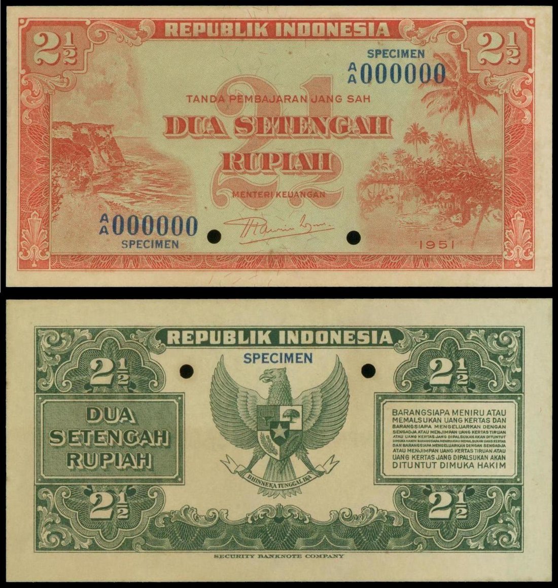 Indonesia, 2.5 rupiah, uniface obverse and reverse specimen, 1951, serial number AA000000, orange on light green, cliffside and palm trees left and right, reverse green, eagle arms at centre, Secutiry Banknote Company,