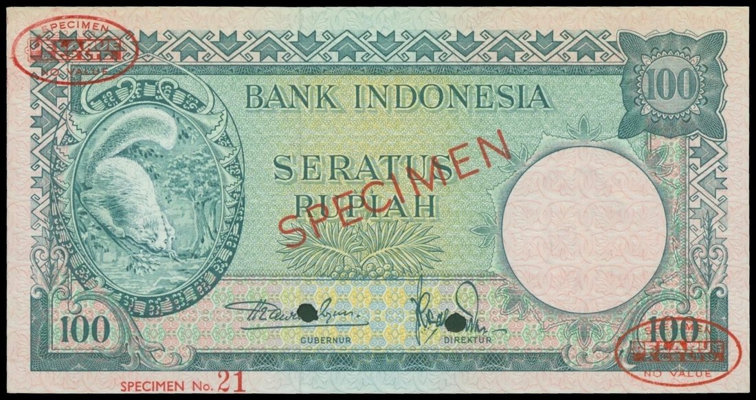 Indonesia, 100 rupiah, specimen, ND (1957), serial number 100A 00000, blue-green and multicolour, squirrel at left, watermark at right, red ‘SPECIMEN’ overprinted at centre,