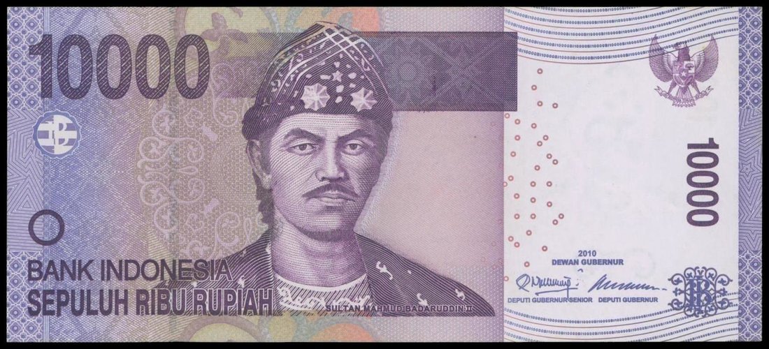 Bank Indonesia, 10,000 rupiahs, specimen proof, 2010, without specimen number, purple on multicolour, Sultan Mahmud Badaruddin II at centre, watermark of himself at right, the reverse shows the Rumah Limas, housed in original cardboard folder showing the ten security features,