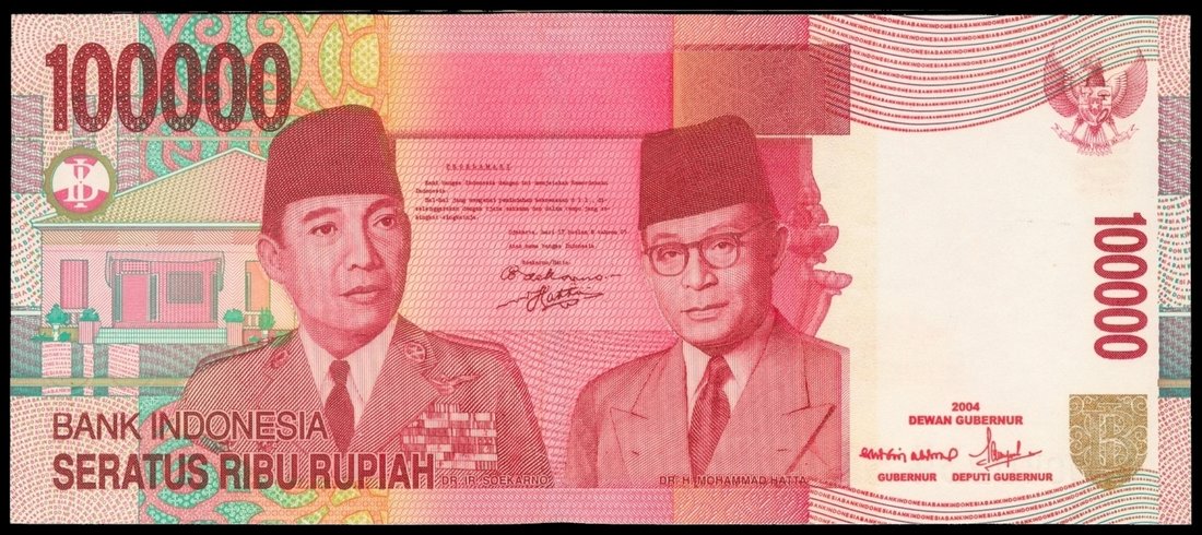 Bank of Indonesia, an ERROR note of 100000rupiah, 2004, black serial WAD040234, NO WATERMARK, red and multicoloured, Achmed Sukarno and Mohammed Hatta at centre, reverse same colour, Parliament building on reverse,