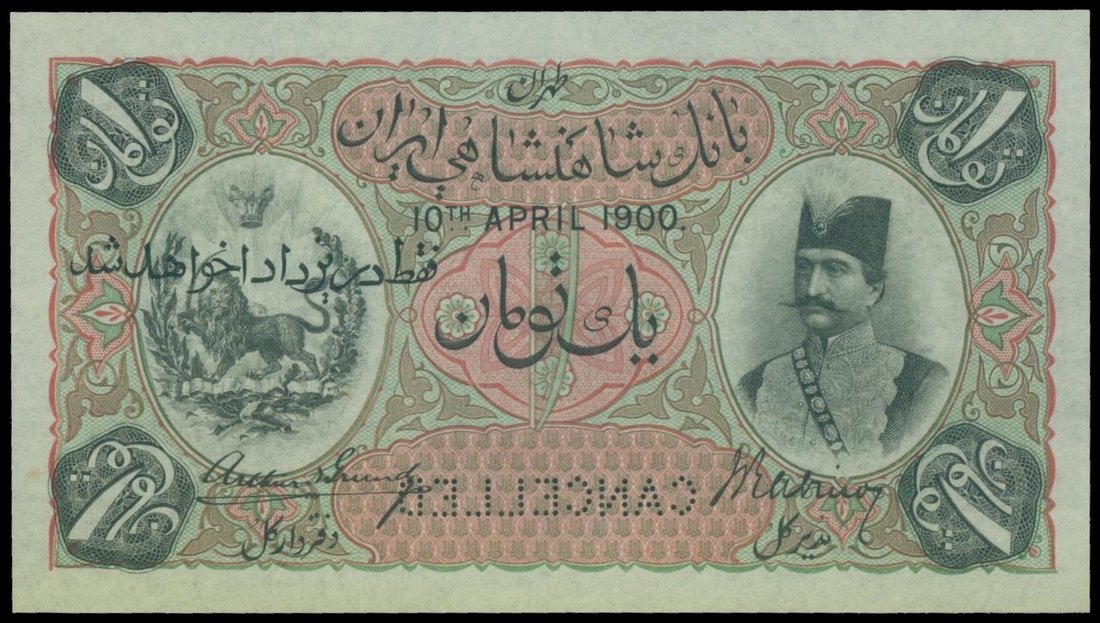 Kingdom of Persia, Imperial Bank, 1 toman, specimen, 10.4.1900, control serial number A780001-A800000, black on pink and light green underprint, Nasred-Din at right, reverse green, state emblem at centre, overprinted 'PAYABLE AT YEZD ONLY' perforated “CANCELLED”,