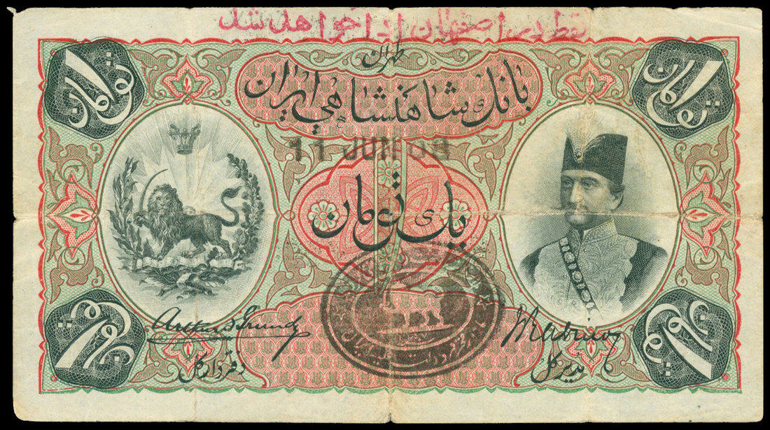 Imperial Bank of Persia, 1 toman, ND (1890-1923), serial number A/D 036682, black on green and [rink underprint, Nasred-Din at right, reverse green, lion at centre, overprinted 'Payable at Isfahan only'