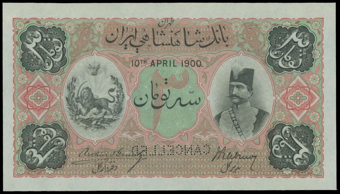 Kingdom of Persia, Imperial Bank, 3 tomans, specimen, 10.4.1900, control serial number C100001-AC125000, green, Nasred-Din at right, reverse blue, state emblem at centre, perforated “CANCELLED”,