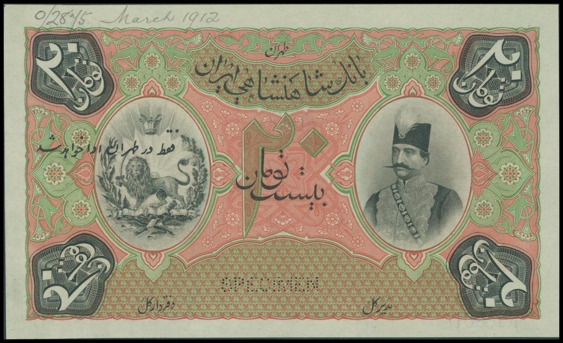 Kingdom of Persia, Imperial Bank, 20 tomans, specimen, ND(1890-1923), control serial number F/B 18001 to F/C 03000. red, green and black, coat of arms at left, Nasr-ed-din portrait at right, perforations at bottom, reverse brown, lion at centre, hand written date 'March 1912',
