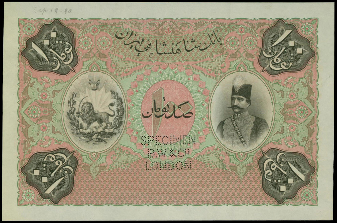 Kingdom of Persia, Imperial Bank, 100 tomans, specimen, hand written date 19.9.1890, control number J00001 J00500, red and green, portrait Nasr-ed-Din at right, reverse orange, lion at centre, perforated “SPECIMEN B.W & Co LONDON",