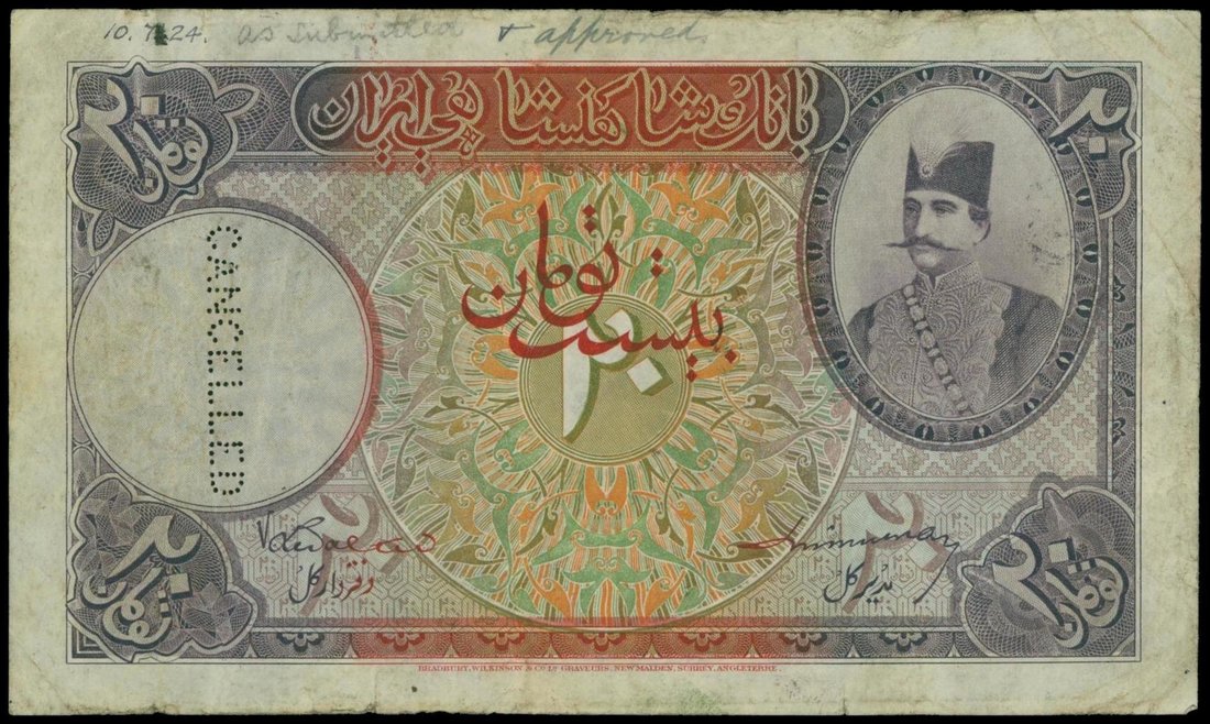 Iran (King of Persia), 20 tomans, specimen proof, hand written date 10.7.1924, red, green and purple, portrait Nasr-ed Din at right, watermark at left, reverse shows a lion at centre, perforated "CANCELLED"