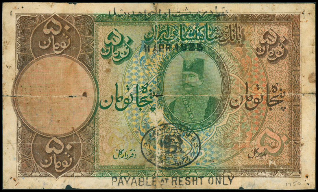 Imperial Bank of Persia, 50 tamans, 11.4.1925, serial number F/B 034816, green and brown, portrait of Shah Nasr-ed-Din at centre right, value at centre and at each corner, slightly faded manuscruipt signatures at lower left anf right, 'PAYABLE At RESHT ONLY' on bottom border, reverse brown and green, arms at centre with the bank title and denomination in English,