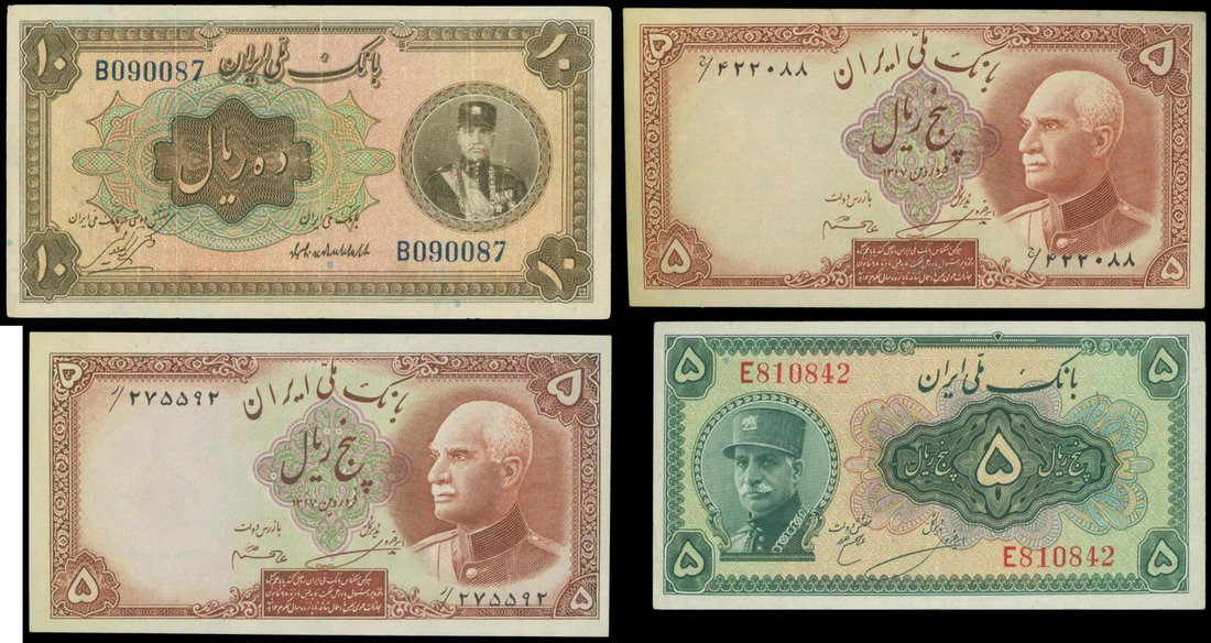 Iran, group of 4 notes, 5 and 10 rials, 1933-1934 with Shah Reza, also 2x 5 rials, 1938,
