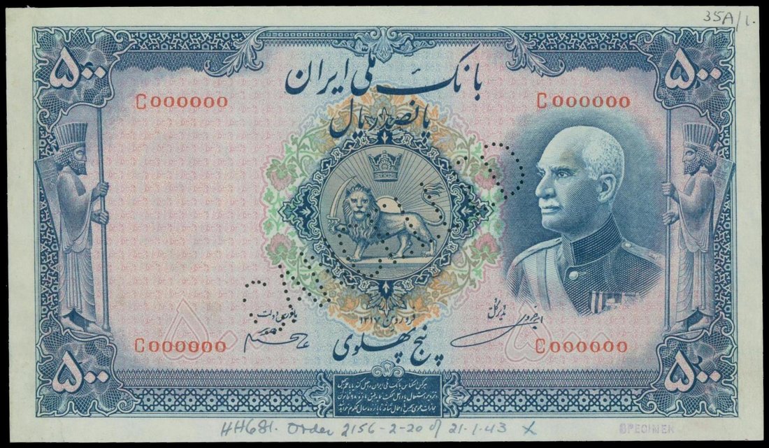 Iran, Bank of Melli, specimen 500 rials, 1938, red serial C000000, blue on multicolour, Shah Reza portrait at right, coat of arms at centre, reverse grave of Cyrus the great at Pasargarde, perforations at centre,